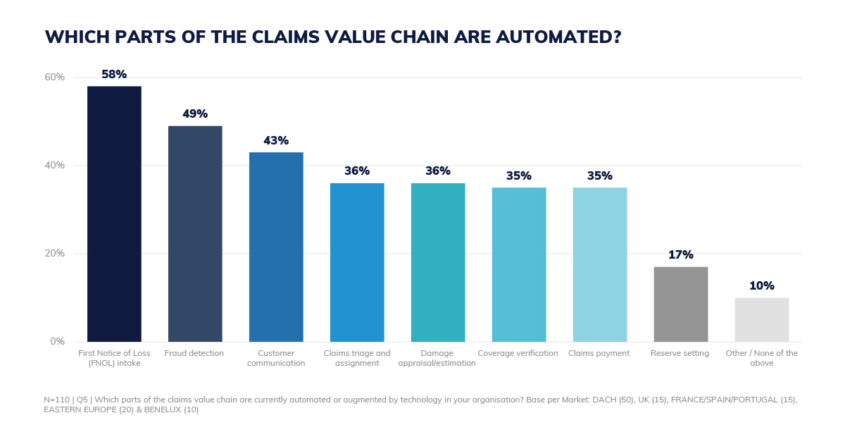 Not all parts of the claims handling value chain are equally automated. The data reveals a clear pattern: customer-facing and detection activities lead, while back-office decisioning lags behind.